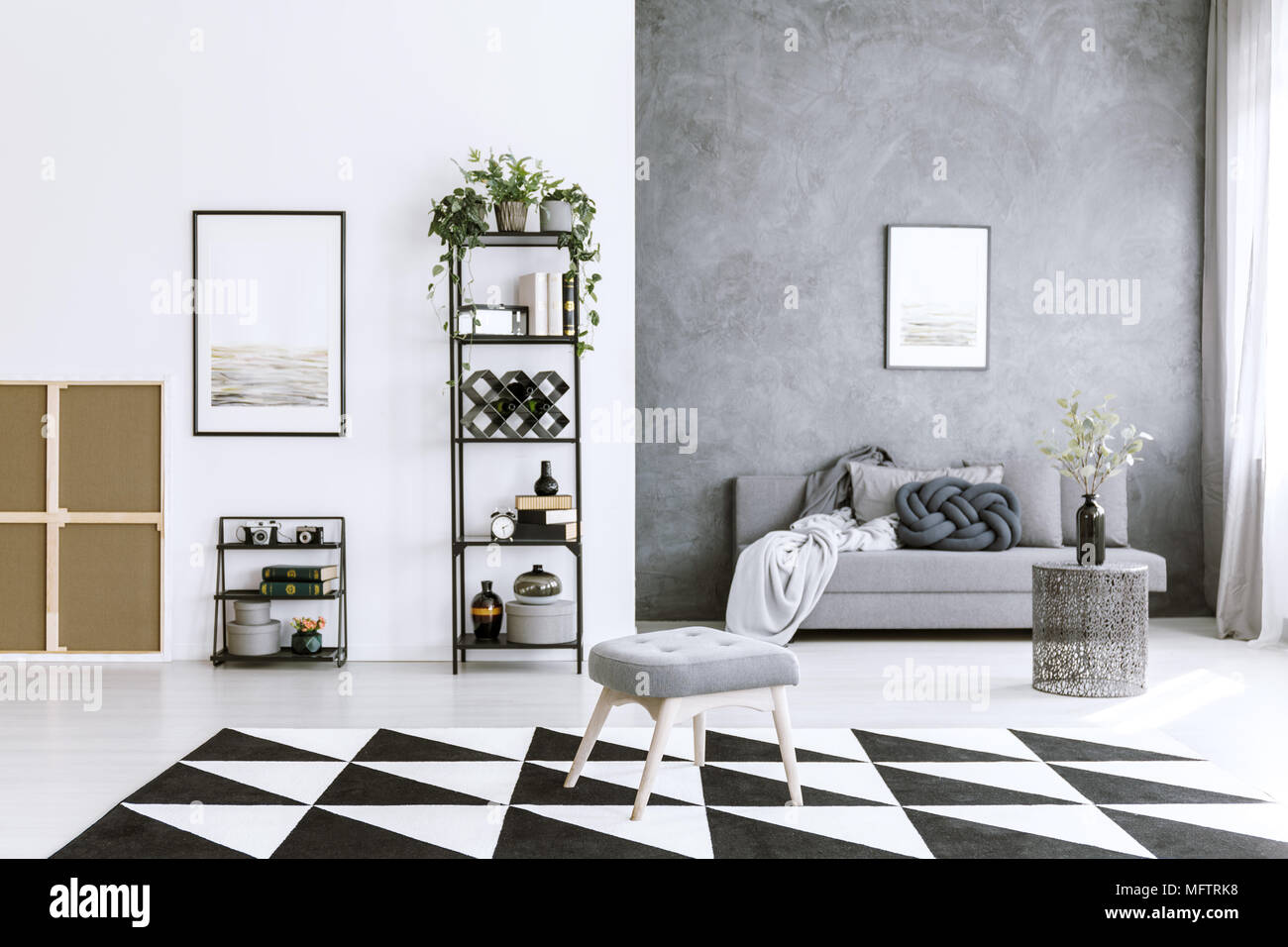 Alfombras geométricas en salón interior con una estantería metálica, sofá, heces, pared gris y pinturas Fotografía de stock - Alamy